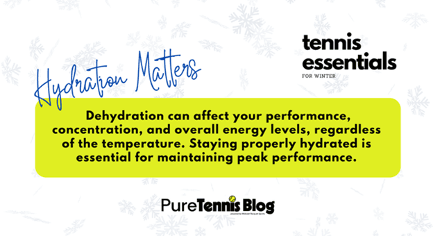 Even though you might not feel as thirsty as you do in summer, you still lose quite a bit of moisture playing tennis in the cooler months. Staying hydrated is crucial. Drink plenty of water or sports beverages, but try adding less ice.
