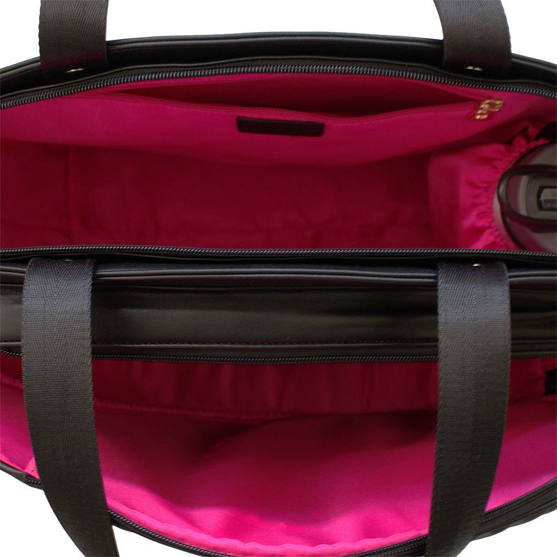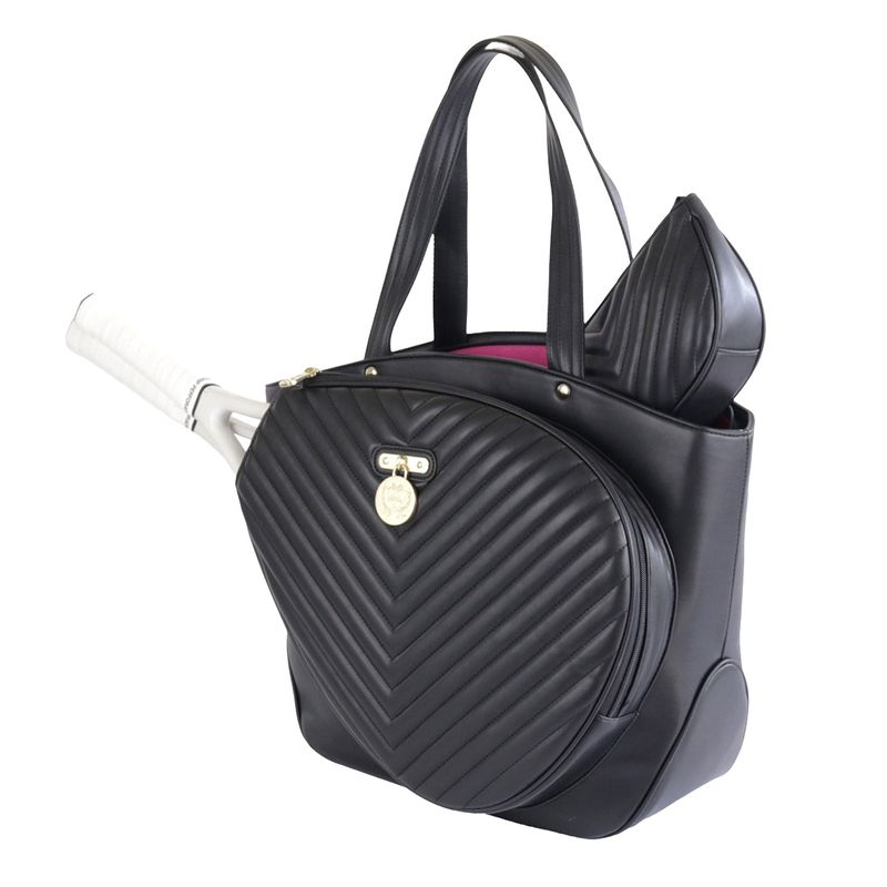 The Court Couture Cassanova Chevron Tennis tote has details on the racquet pocket as well as on the cosmetic case fronts. The tote features a separate compartment that fits two tennis racquets.