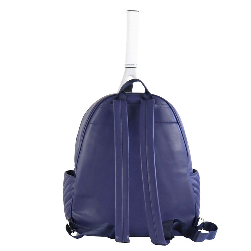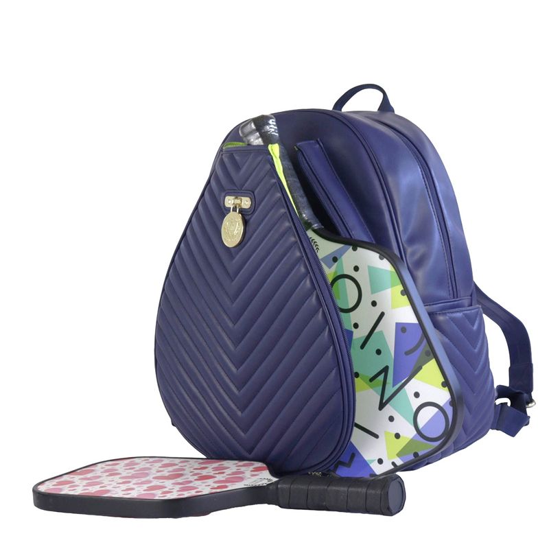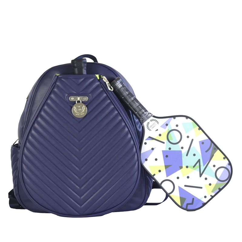 A bold chevron pattern gives this bag a modern, standout look, while the coordinating purse adds a stylish finishing touch. Designed to hold up to two tennis racquets or three pickleball paddles, it also offers generous storage with multiple interior compartments, including a zip pocket and dedicated slots for smaller essentials. Convenient side pockets store a water bottle and a can of tennis balls, and there’s ample room for shoes and clothing. The wipe-clean surface makes upkeep easy, while the contrasting interior lining adds a vibrant pop of color. Finished with elegant gold-tone hardware and logo accents, plus adjustable straps for a comfortable carry, this bag blends function with refined style.