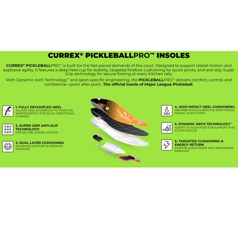 The official insole of Major League Pickleball, CURREX PICKLEBALLPRO delivers the stability, comfort, and agility modern players demand. Dynamic Arch Technology adapts to your foot type—HIGH, MEDIUM, or LOW—providing personalized support that moves with you, absorbs impact, and enhances balance during fast lateral transitions.