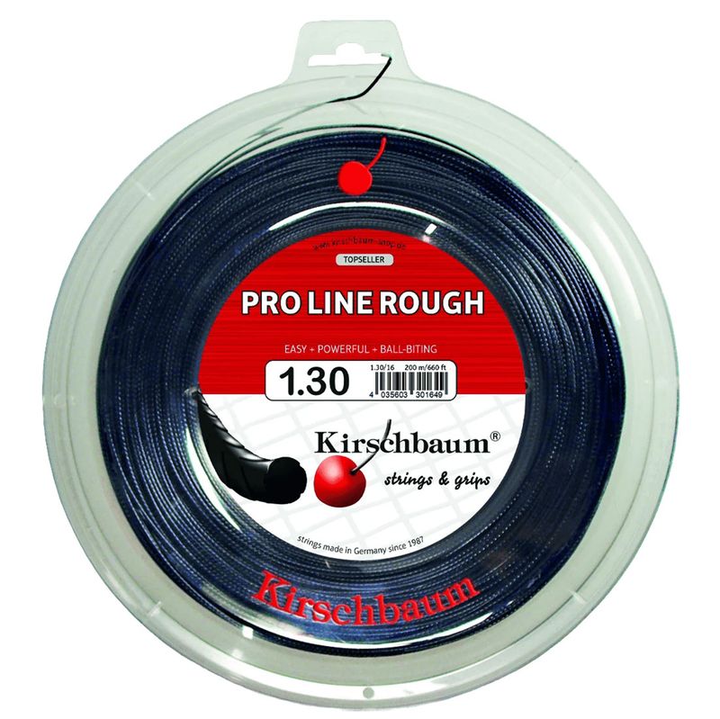 Kirschbaum Pro Line Rough REEL offers tournament players an extraordinary mixture of power, control and spin-potential. A constant dynamic response of the stringbed and the maintenance of the installed string tension grant steady playing characteristics and performance. Works great as a hybrid! A more playable, slightly softer option to Kirschbaum Pro Line No. I. Added texture to one of Kirschbaum's signature co-poly strings! Outstanding combination of power and control.   Highest spin-potential without string-slipping  Extreme durability and best tension-maintenance.  Added texture ideal for spin development  Color: Black  Gauge: 16 (1.30mm)  Length: 660ft. (200m)