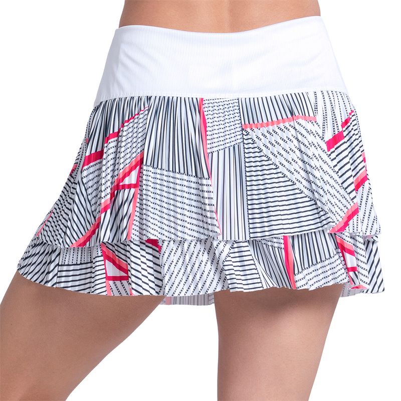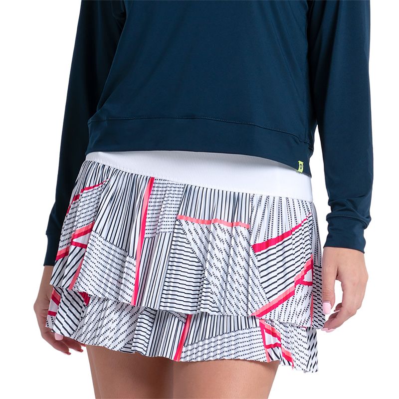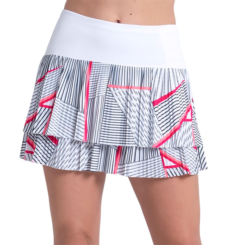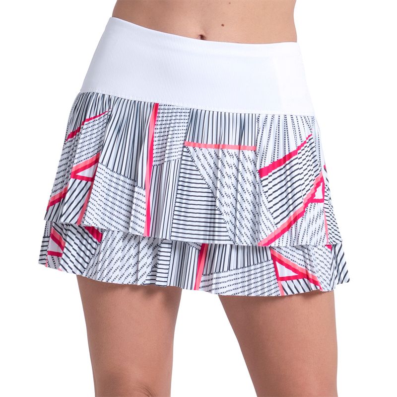 Elevate your tennis wardrobe with the bold look of the Lucky in Love Glow Set Collection. The Glow Set Geo Glow Skirt features thick waistband, double-layered knife pleats, and built-in ball shorts. Made with technical fabric to wick sweat away for optimal comfort.
