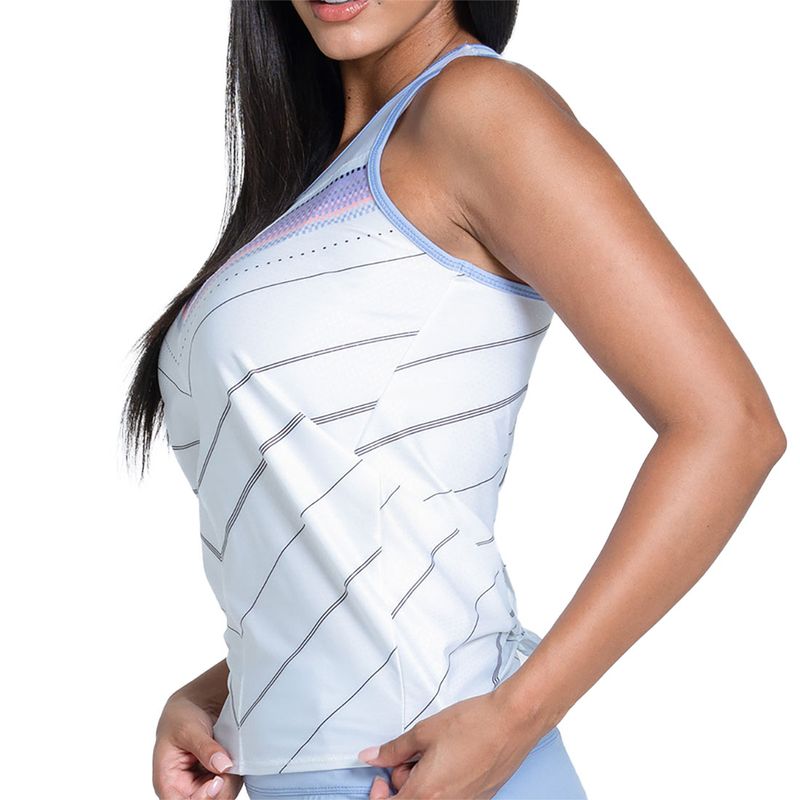 Unlock your A-game on the courts this summer in the purple and orange tones of the Lucky in Love Lavender Love Collection. The Lavender Love Tie Back Tank Top is a full coverage tank that features a tie-back detail and striped design. Made with technical fabric to wick sweat away for optimal comfort on the court.