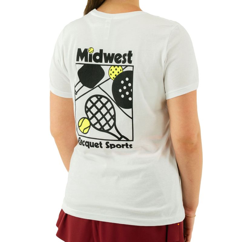 The Midwest Racquet Sports Graphic Tee Shirt in White showcases the iconic MWS logo in a clean, versatile design suited for active players and fans alike. Made from soft, breathable fabric, it keeps you comfortable whether you're warming up on the court or relaxing after a great match. Support your local tennis community in style with this classic graphic tee.