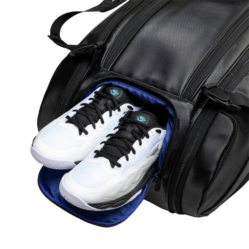 The 10R Tour Staff Bag is a premium racquet bag built to carry everything you need for a full day on court. Mizuno’s proprietary Split-Strap technology evenly distributes weight for enhanced shoulder comfort during transport. Featuring five spacious compartments, including a dedicated shoe pocket for ventilation and easy access, it keeps your gear organized and separated. Racquet partitions, an accessory pocket, and interior dividers provide added customization and storage flexibility. Measures 30" L x 14" W x 14" D with a 70-liter capacity.