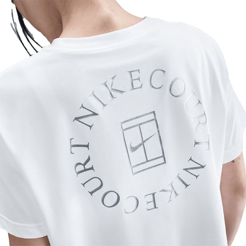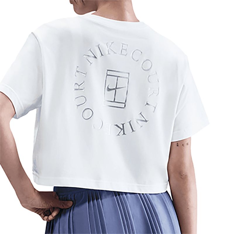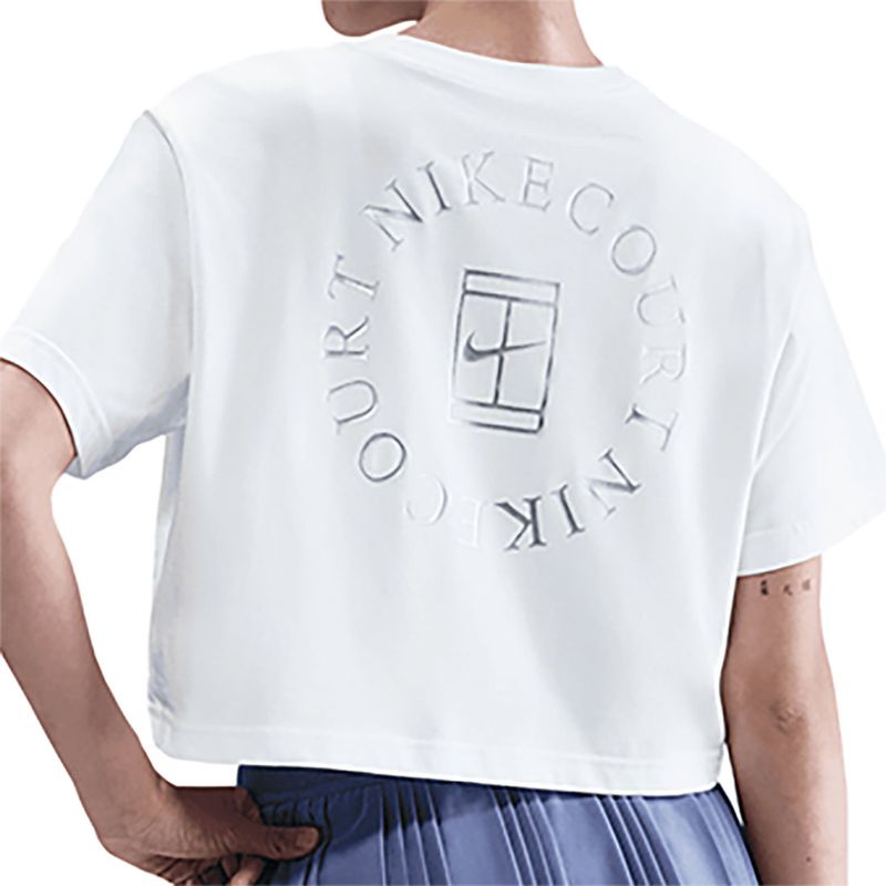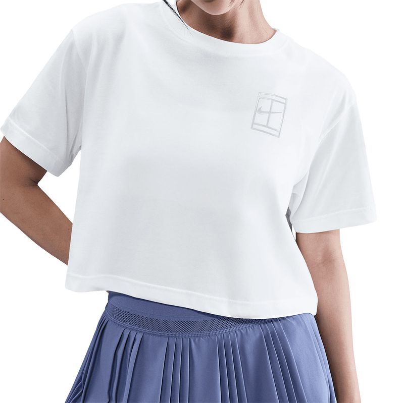 Step onto the court with confidence and style in the Nike US Open Collection, where performance meets innovation for your best game yet. The Nike Court Slam Crop Tee Shirt is a comfortable crewneck with a Nike Court graphic and a cropped hem. Made with Dri-Fit technology for optimal breathability and moisture wicking.