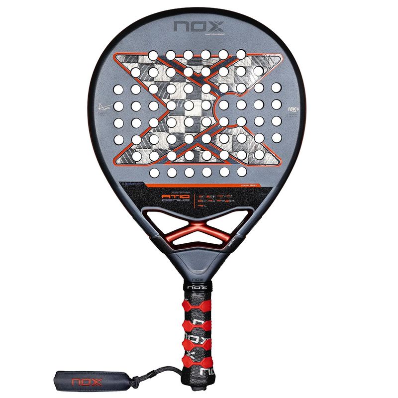 The NOX AT10 Genius 18K Alum 2025, developed with Agustín Tapia, is a versatile teardrop-shaped padel racket designed for advanced players seeking the perfect balance of power, control, and maneuverability. Its 18K aluminized carbon face and MLD Black EVA multilayer core deliver a solid, comfortable feel with consistent performance in both defensive and attacking situations. Technologies such as Exclusive Spin, EOS Flap, and Pulse System enhance spin potential, maneuverability, and vibration reduction. A carbon tubular frame with Dynamic Composite Structure improves durability and structural stability during intense rallies. Finished with the Smartstrap® system and Custom Grip, the AT10 Genius 18K Alum 2025 offers precision, comfort, and elite-level versatility.