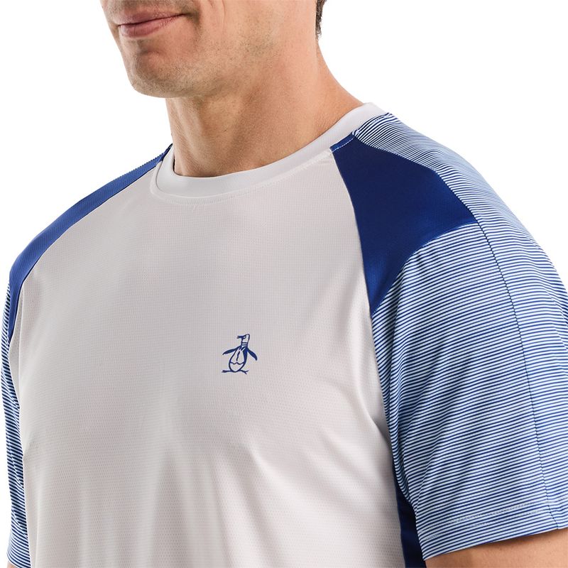 Penguin’s Summer 2026 Collection features classic silhouettes and fun prints that will keep you looking and feeling your best on the courts all season long. The Retro Tech Block Crew features a lightweight, ventilated material, a crew neckline, and a graphic print. Made with recycled performance materials.