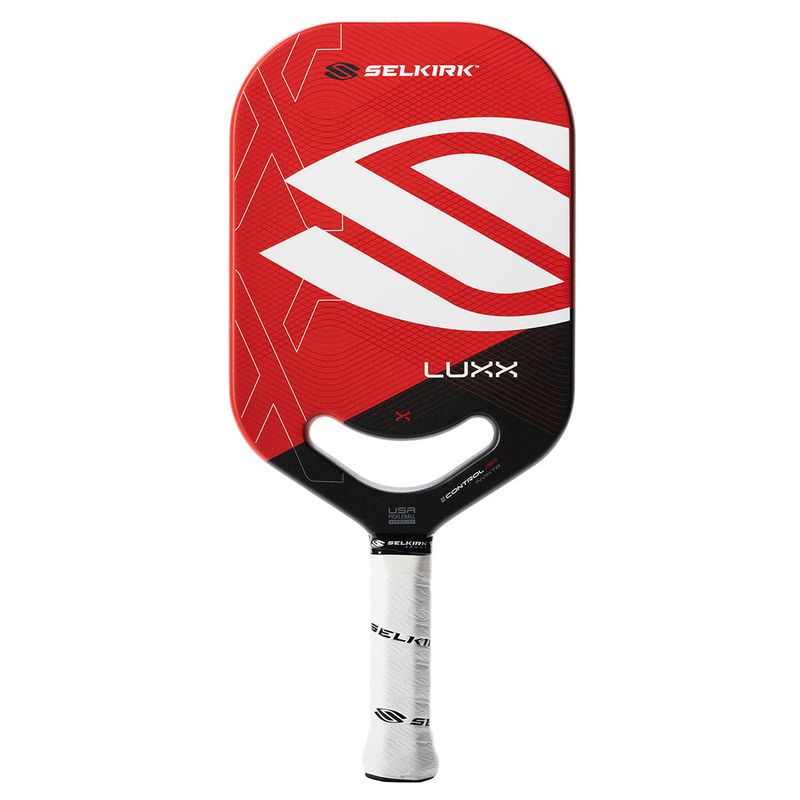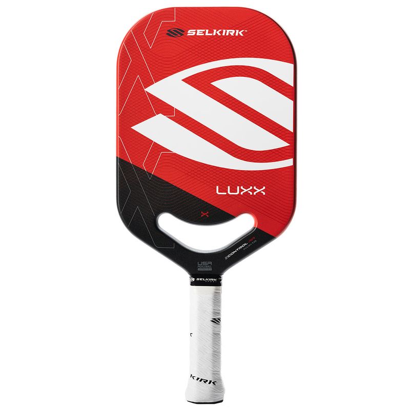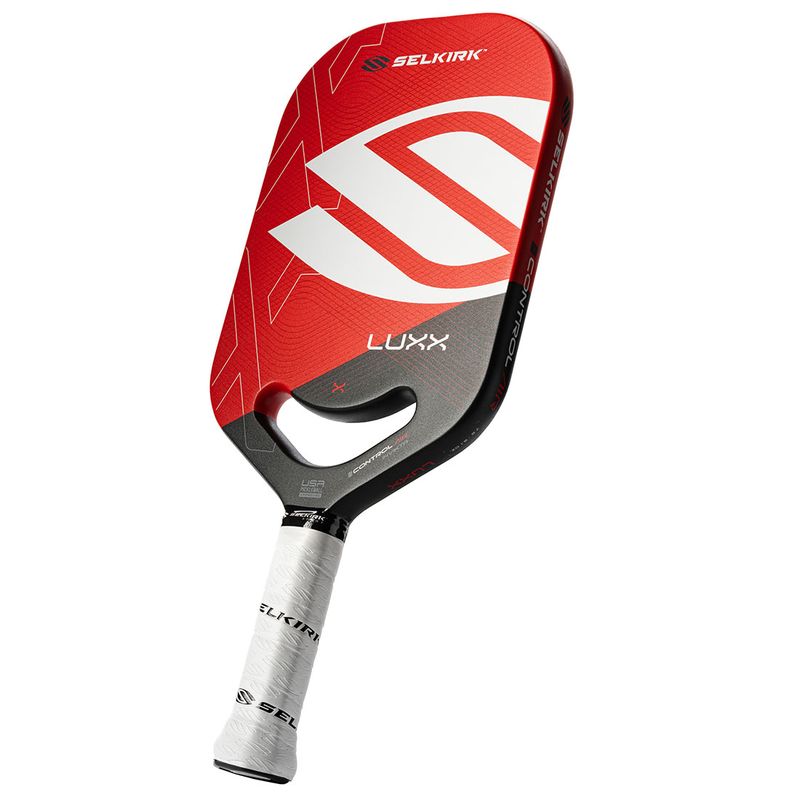 Presenting the Luxx Series Control Air Invikta by Selkirk Sport, the ultimate control paddle that combines groundbreaking Florek Carbon Fiber technology with Selkirk's renowned 20mm X7 Thikset Honeycomb core. This paddle boasts an expanded sweet spot, impressive power, accelerated spin, and unmatched control. Its innovative features include Air Dynamic Throat, ThroatFlex open throat design, ProSpin+ NextGen Texture, and CM Anti-Torque Technology, all contributing to a smooth, controlled playing experience. Red version.