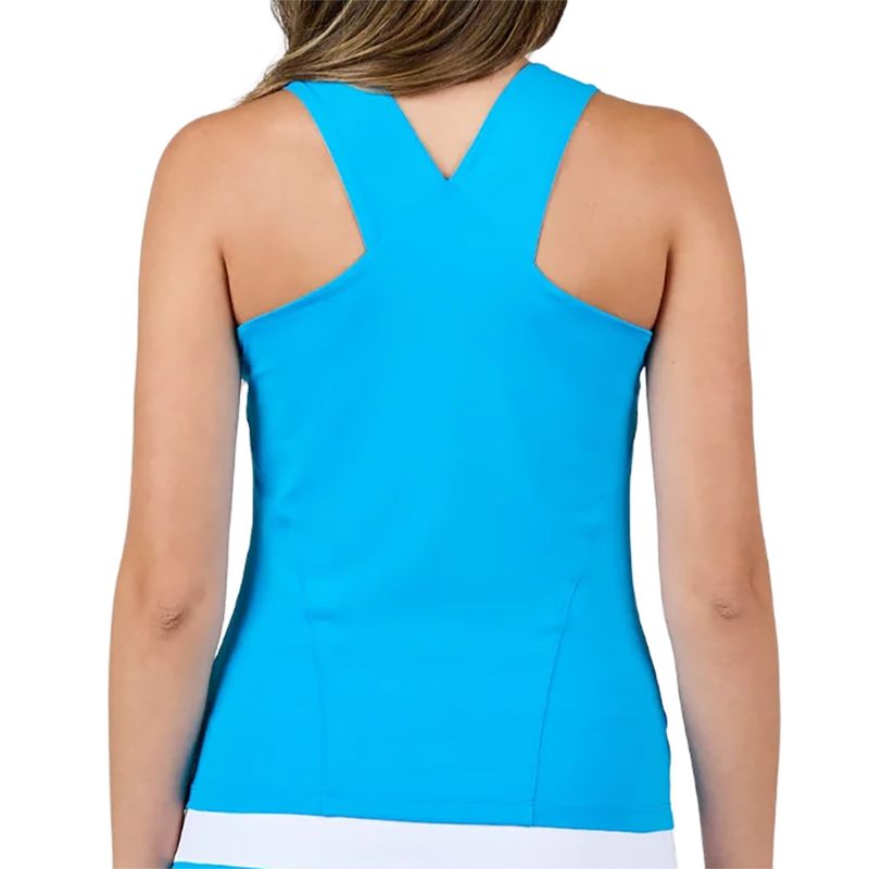 Keep it cool on the courts in the soft blues of the Sofibella Electric Blue Collection. The Electric Blue Racerback Tank Top features a V-back and a built-in shelf bra. Made with quick-drying, antibacterial, and UV protection materials.