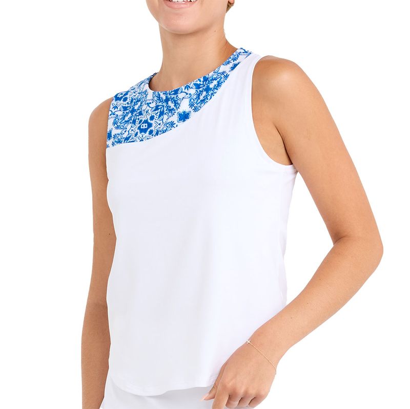 Keep it cool on the courts this spring in the tile prints and blue tones of the Sofibella Miss Santorini Spring 2025 Collection. The Miss Santorini Tank Top features printed inserts, a back cutout, and a slightly cropped hem. Made with quick-drying, antibacterial, and UV protection materials.