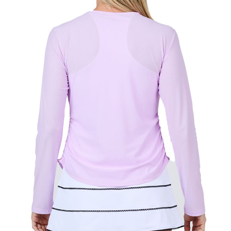 Strut your style on the courts in the cool pinks and purples of the Sofibella Mystic Sunrise Collection. The Mystic Sunrise Long Sleeve Top features a magic mesh material and ruched sides with adjustable drawcords. Made with quick-drying, antibacterial, and UV protection materials.