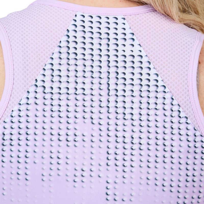 Strut your style on the courts in the cool pinks and purples of the Sofibella Mystic Sunrise Collection. The Mystic Sunrise Tank Top features mesh inserts, lavender binding, and an all-over gradient dot print. Made with quick-drying, antibacterial, and UV protection materials.