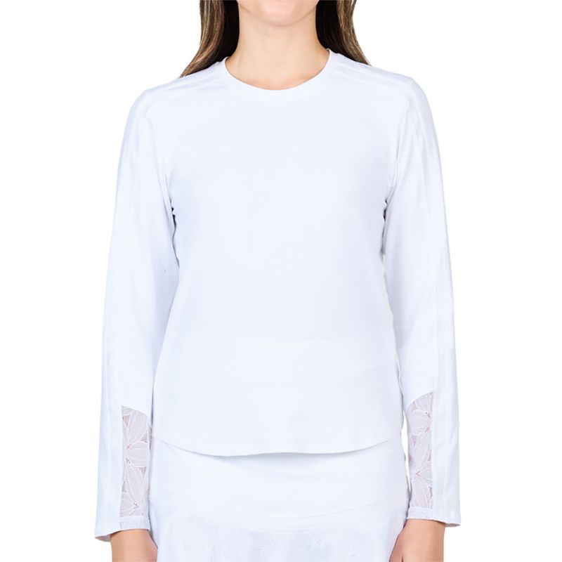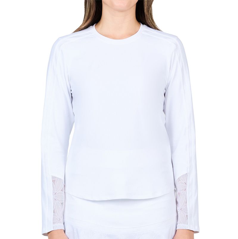 Keep it clean and classy in the crisp whites of the Sofibella White Lotus Collection. The White Lotus Long Sleeve Top features a soft rib neckline and lotus jacquard inserts. Made with quick-drying, antibacterial, and UV protection materials.