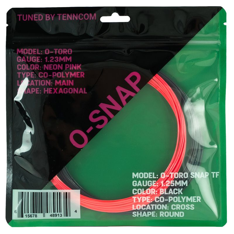 Tuned by TennCom, O-Snap is a high-performance hybrid that blends a softer, spin-focused main string with a firmer, ultra-slick cross for enhanced snapback and responsiveness. The O-Toro Neon Pink mains deliver excellent ball grip and rotation, while the O-Toro Snap Tour Flex Black crosses promote faster string movement and a crisp, controlled feel at impact. This soft–firm pairing creates a lively, spin-friendly setup ideal for modern players who want both comfort and precision.