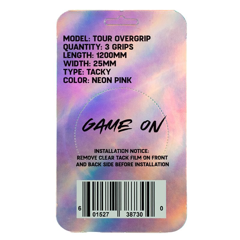 Dial in your feel with the Toroline Tour Overgrip Neon Pink 3 pack, designed with an ultra-elastic, soft, and tacky surface for superior comfort and playability. Its double-tapered ends create a clean, professional finish with no trimming required—just wrap and go. Available in multiple tack levels, it lets you customize your grip to match your setup, while color options pair perfectly with your favorite TOROLINE strings. Independently lab tested for safety and performance, this overgrip delivers reliable feel with every swing.