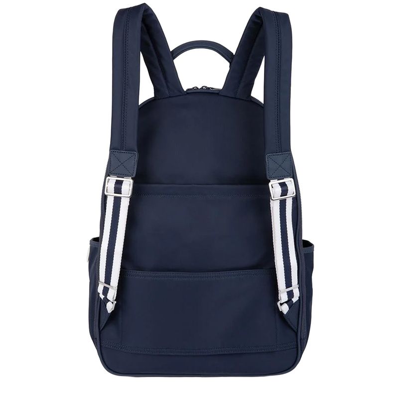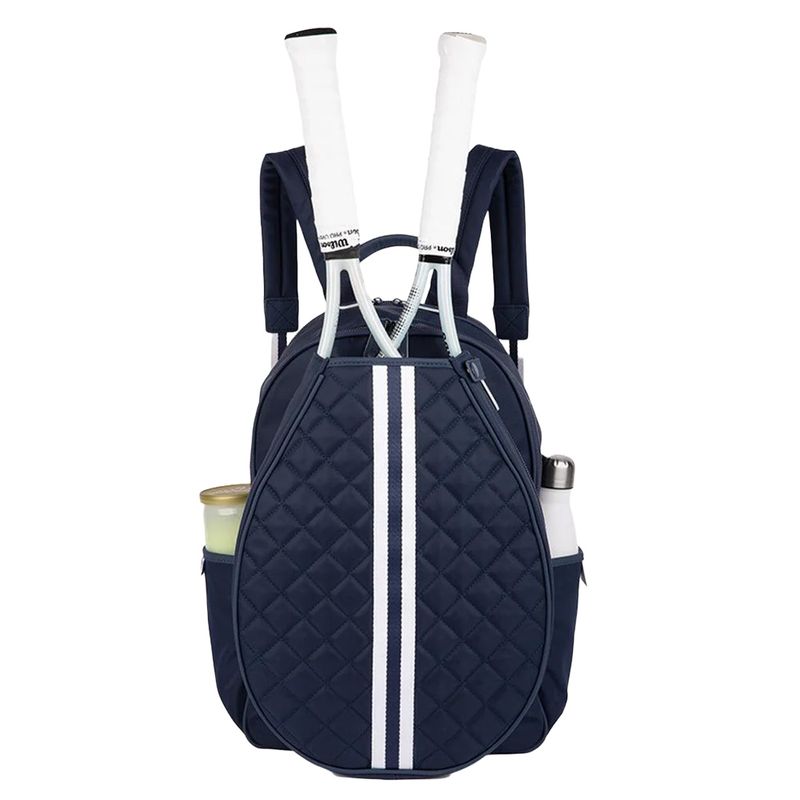 The Trelle Darling Backpack combines timeless elegance with everyday practicality, making it the perfect addition to your tennis wardrobe. Made from lightweight, premium nylon, this sporty and stylish backpack is water, tear, and fade-resistant, ensuring durability. It features padded, adjustable straps and a zip closure for comfort and security. The exterior zip pocket accommodates up to two standard-size tennis racquets, while two water bottle pockets keep hydration close. With a padded back compartment for a 15-inch laptop, built-in trolley sleeve, and multiple interior pockets, the Trelle Darling offers premium functionality for life on the go. Dimensions: 13"L x 9"W x 17"H.