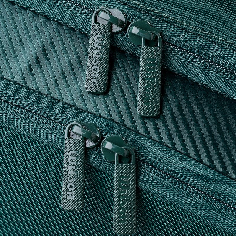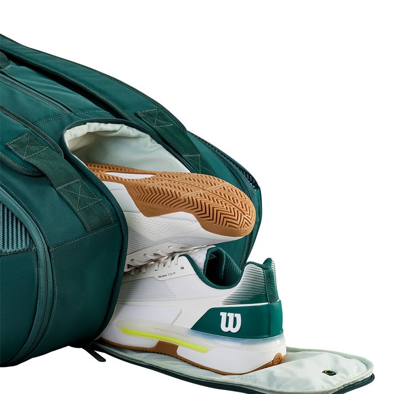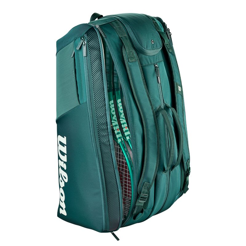 The Wilson Blade V10 Super Tour 15 Pack is the ultimate bag for the serious competitor who never leaves anything behind. Three main compartments accommodate up to 15 racquets, apparel, and accessories, while Thermoguard lining in two of those compartments shields your strings and gear from extreme temperatures. A ventilated shoe pocket keeps footwear separate and fresh, and two large exterior side pockets plus a dedicated valuables pocket keep your essentials organized and within easy reach. Adjustable ergonomic padded shoulder straps make it comfortable to carry even when fully loaded.