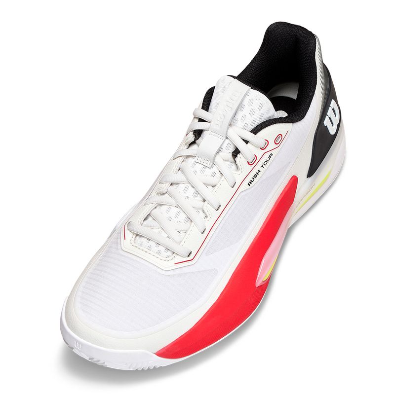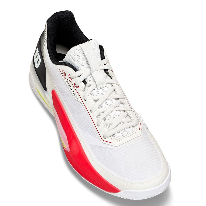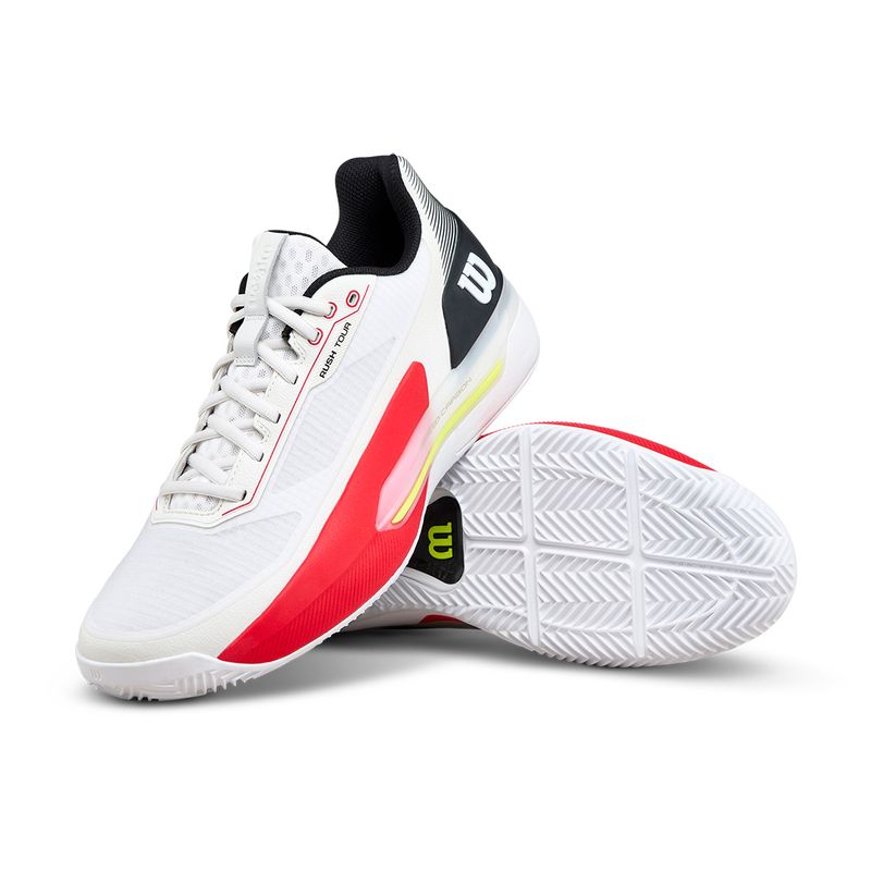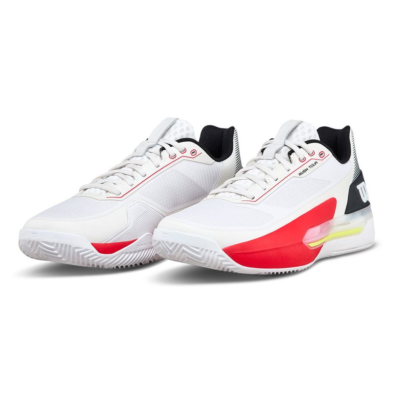 The Wilson Rush Tour 5 Clay is engineered for aggressive movers who demand speed, stability, and durability on clay courts. A locked-in fit works with the Dual Axis Speed Carbon chassis and EndoFit midfoot support to deliver confident lateral control for hard cuts and explosive direction changes. The responsive super foam midsole provides quick acceleration and energized recovery, while drop-in construction enhances connection to the court. A breathable Gammaweave mesh upper balances airflow with long-lasting durability through extended rallies. Finished with a clay-specific Duralast outsole, this shoe delivers dependable grip and sliding control built for relentless clay-court play.