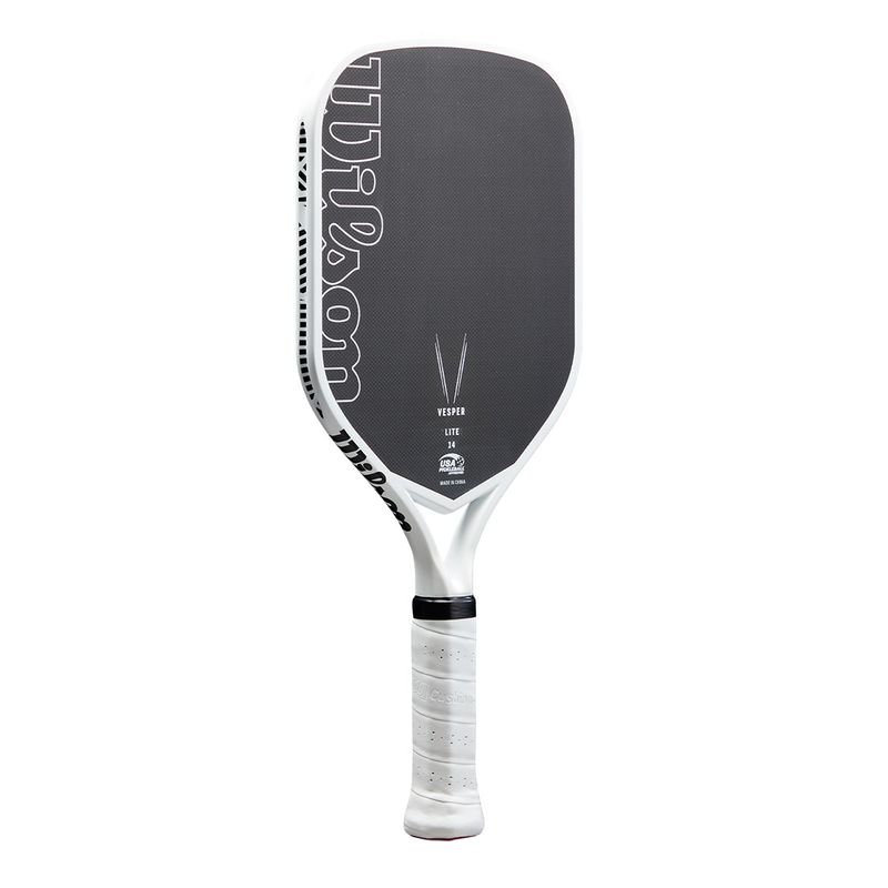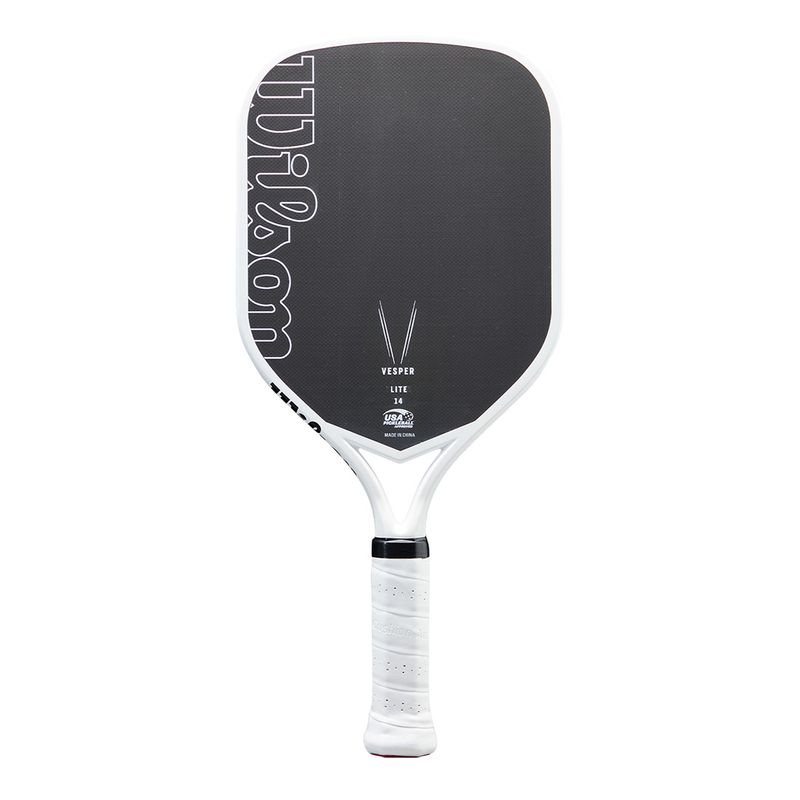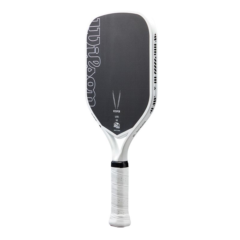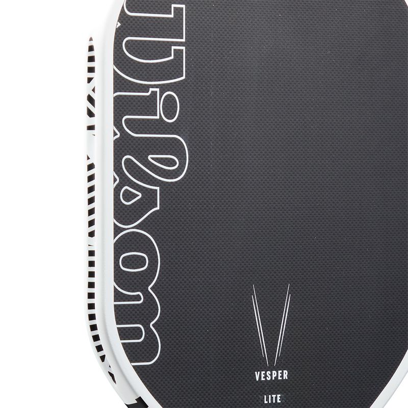 Offering the maximum power allowed by USA Pickleball, Wilson's Vesper Lite Pickleball Paddle gives competitive players more power without sacrificing precision. The first-of-its-kind bladder-molded frame and open-throat design optimize compaction while introducing bending into the mix, resulting in performance-enhancing power, speed and maneuverability. The elongated shape with an extended, one-piece handle increases reach, promotes power and provides a consistent feel that's capable of two-handed backhands. The woven carbon face with a high-density foam core maximizes the sweet spot and gives you plenty of spin.